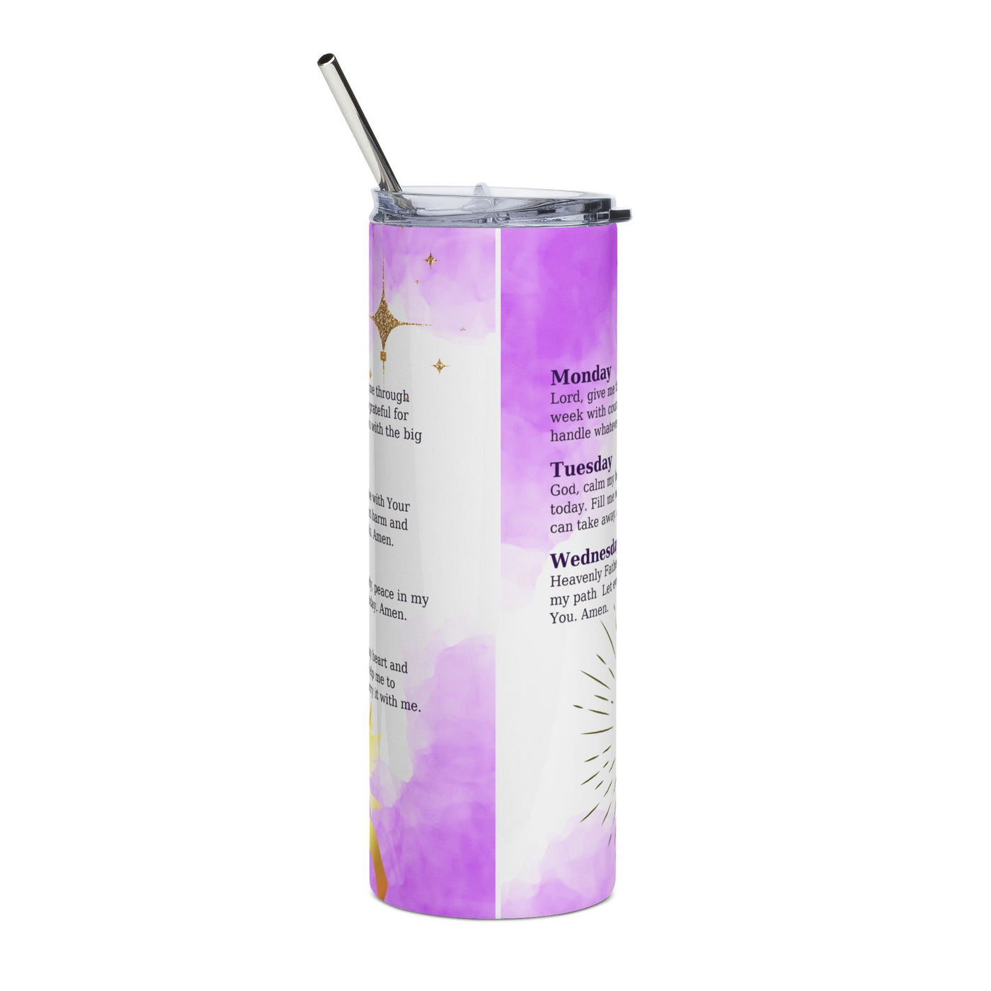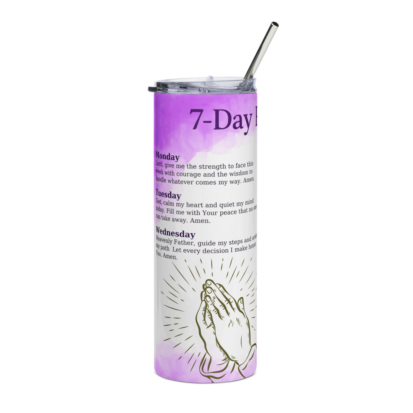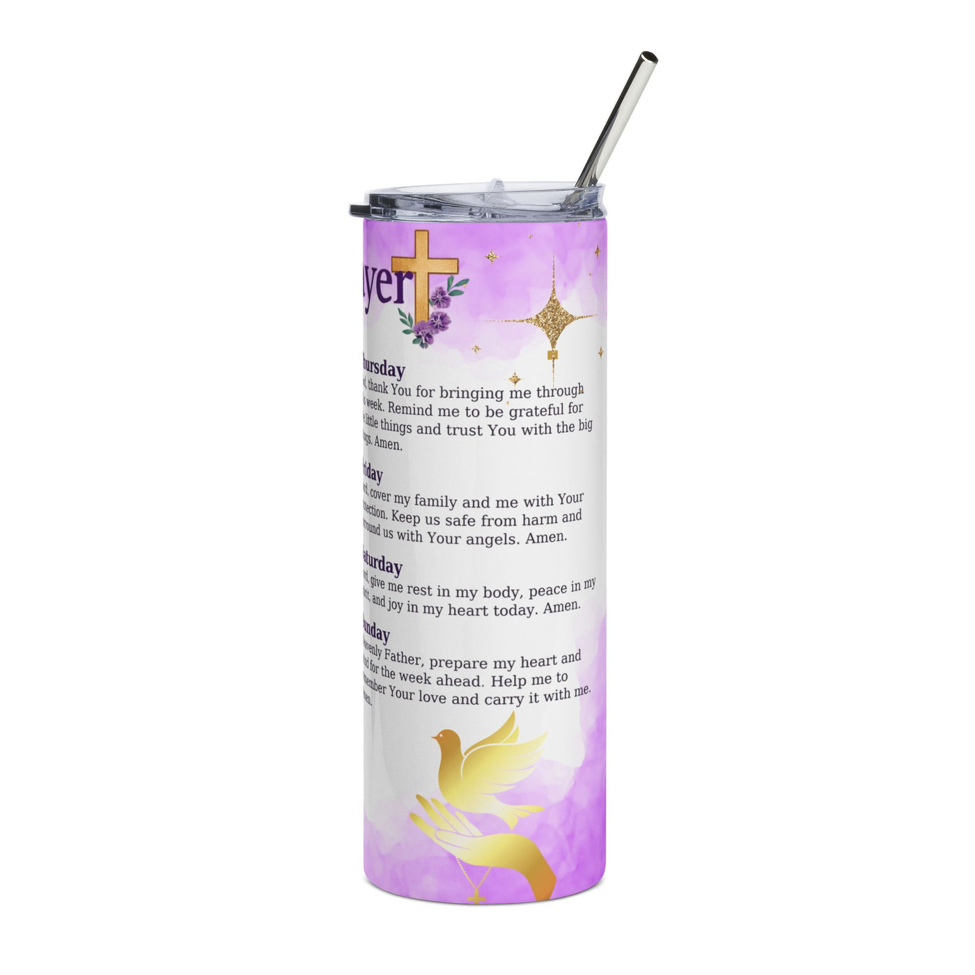 Spring 7 day prayer Stay refreshed in style with this high-grade stainless steel tumbler. With a generous 20 oz (600 ml) capacity, this tumbler is perfect for your favorite beverages on the go. Its sleek cylindrical shape features a 360-degree design for full personalization.